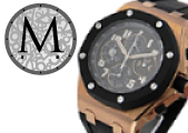 The Audemars Piguet Royal Oak Offshore Rubber Clad Chronograph has a 44mm 18K Rose Gold case, black rubber bezel and dark grey/black subs dial. Water resistance is 100 meters.